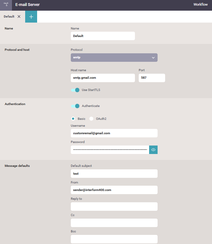 This is the internal name of the email server configuration. You can refer to this in the workflow, when you want to email e.g. in the Create PDF email component. You do not need to use the name, DEFAULT. You can just replace this with another name if you want.