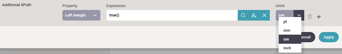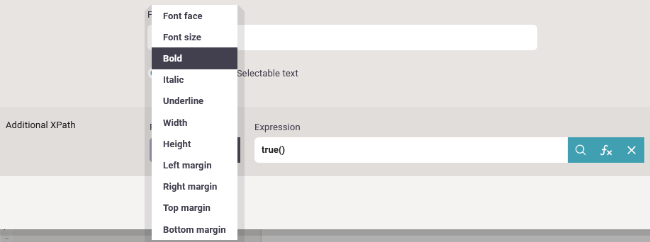To use an XPath expression or a variable in a text element you first need to insert a text element, that you can change. Then you can double click on the text to edit the properties: