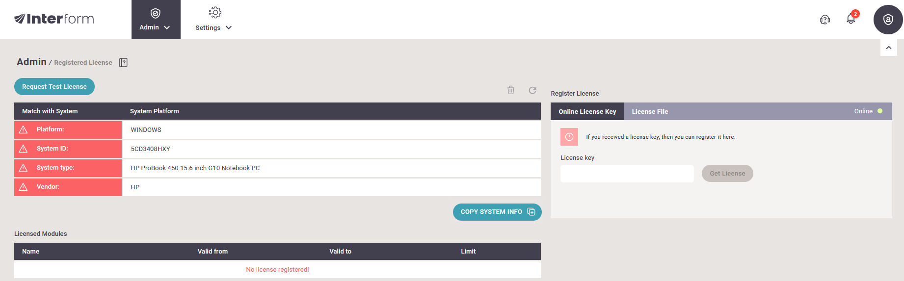 To install a license key you click the Online License Key tab as shown above, copy and paste or type in the license key, and then press Get license to register the installation to start using the license key. Internet access and a connection to the Interform license server is required.