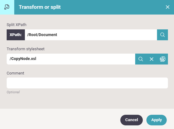 The transform or split workflow component is able to transform and/or split an input XML file. The subtree of this workflow component is executed for each splitted/transformed XML.