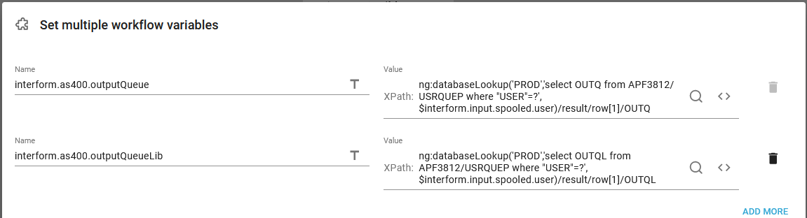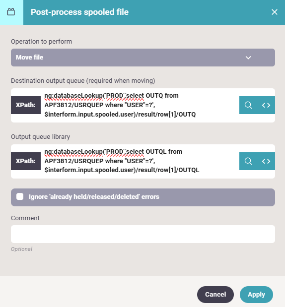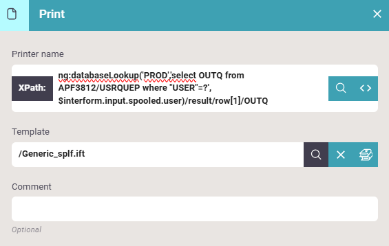 ng:databaseLookup('PROD','select OUTQ from APF3812/USRQUEP where "USER"=?',$interform.input.spooled.user)/result/row[1]/OUTQ