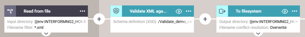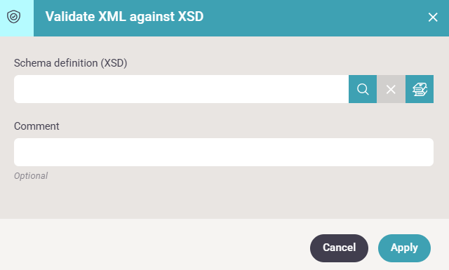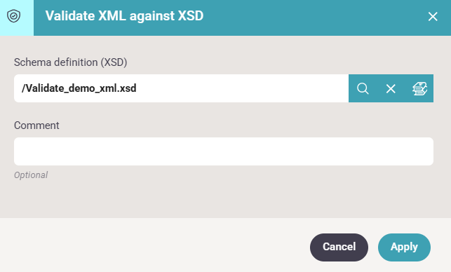 The XSD to validate against is selected as an attribute. The XSD can loaded in the "transform" folder in the library. An XSD file in the library is allowed to include other XSD files that are also in the library, using relative paths (just like in a normal file system).