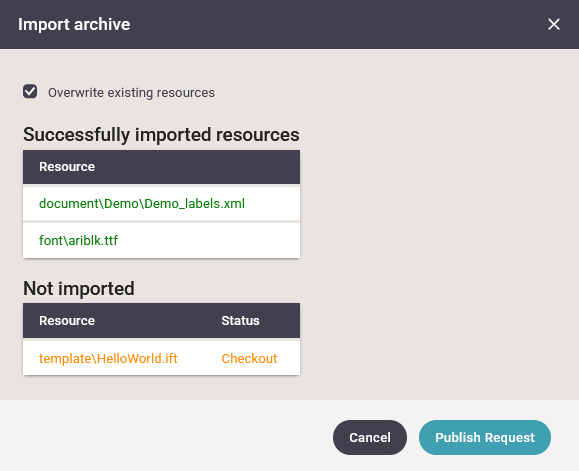 A very important part of versioning is, that you only change the versioned resources via the web interface of InterformNG2. If you want to upload a new version of resources, that exists and are versioned, then you first need to check out the resource. If you do not check out the resource, then you are first warned, that the resource already exists like below: