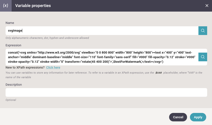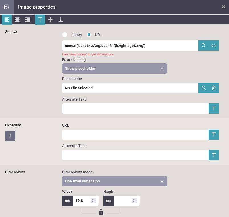 This expression converts the SVG image into base64 (with the function, ng:base64()) and then it tells InterformNG2, that the image is defined as a base64 data string (the initial base64 text).