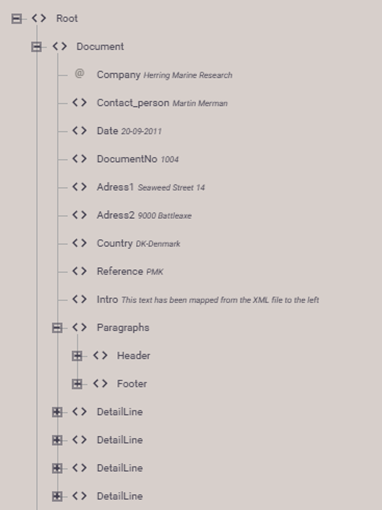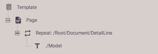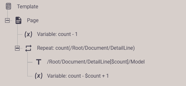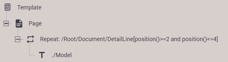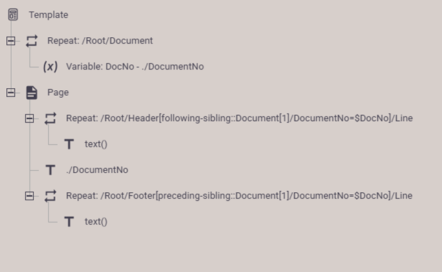 In the setup above we create one separate page for each Document node and inside the page we select the Header lines with this repeat: