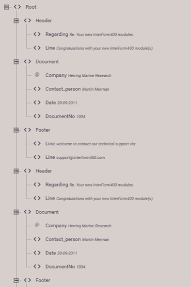 For each of the Document nodes there may be a Header and a Footer section. Both of them are optional, but the Header is always found just before the Document and the Footer is always found just after the Document.