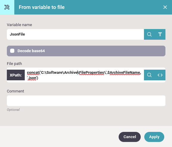 You can also use workflow variables in an XSLT file e.g. to insert base64 data into an XML file. You can convert a file into base64 encoding with the workflow component, To base64 and then run a transformation like this: