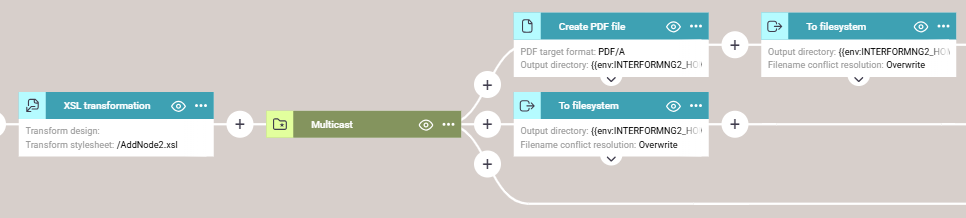 Here is a workflow, that use the stylesheet to convert the input XML file, use the converted XML as input for a merge with a template and save this and the transformed XML into the file system:
